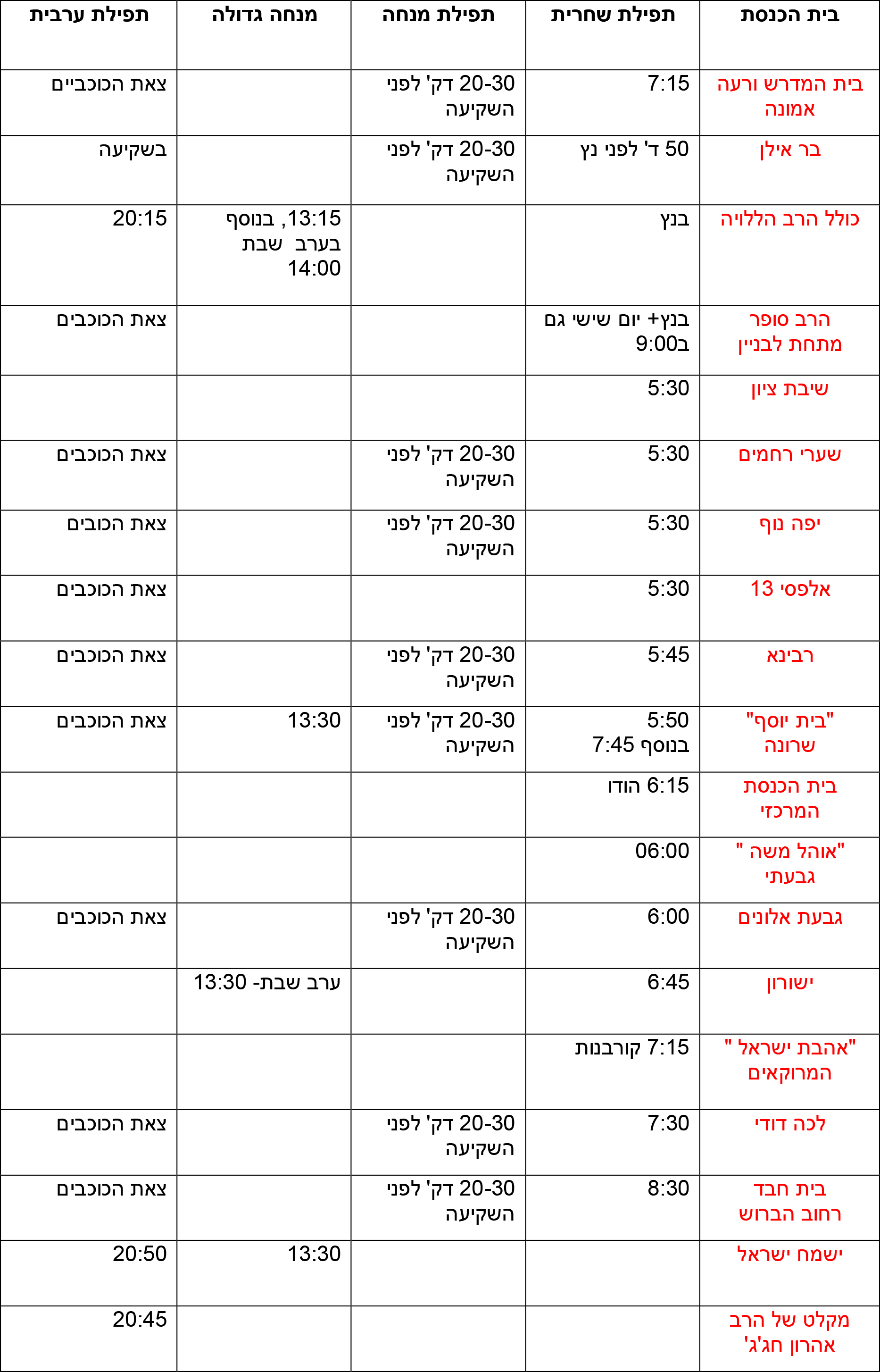 זמני תפילות בבתי כנסת